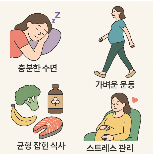 - 스트레스 관리: 호흡 명상, 클래식 음악 태교, 산책 추천